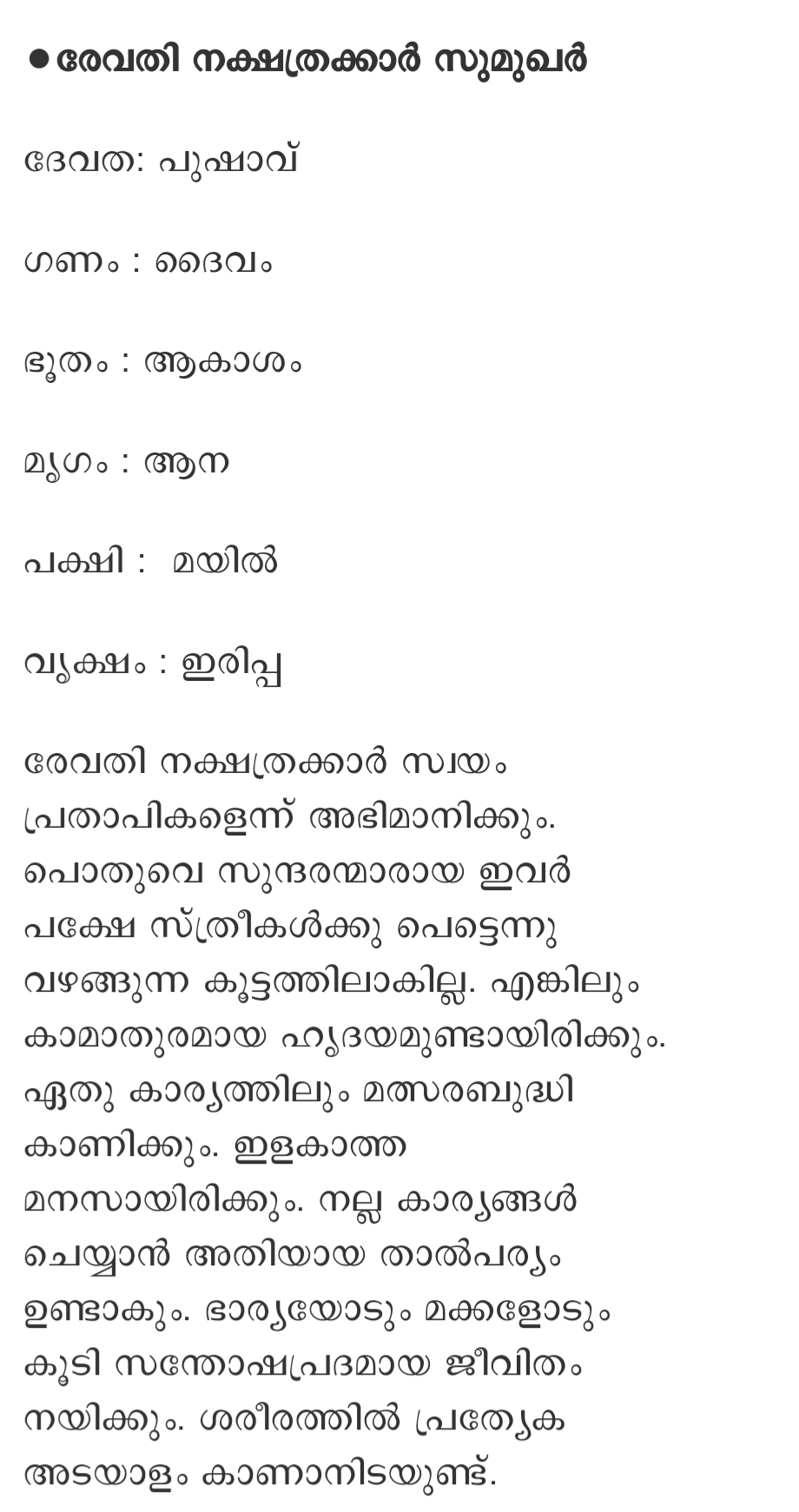 ആ പുസ്തകം അരിച്ച് പെറക്കിയിട്ടും വാരഫലം പോലെയുള്ള ഒന്ന് അവന്റെ കണ്ണിൽ പെട്ടില്ല. അവസാനം അനുബന്ധത്തിലാണ് ‘ അറിയാം 27 നക്ഷത്രക്കാരുടെയും പൊതു സ്വഭാവങ്ങൾ‘ എന്ന തലക്കെട്ട് കാണുന്നത്. അതിൽ രേവതി നക്ഷത്രക്കാരുടേത് മാത്രമായി അവൻ ഫോട്ടോ എടുത്തു.