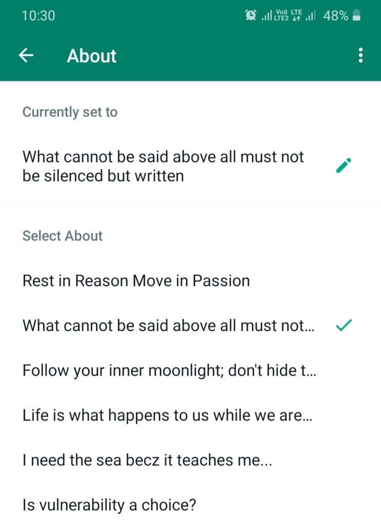 എന്റെ വാട്സപ്പ് സ്റ്റാറ്റസ് കണ്ട് അവൾ ചോദിച്ചു.