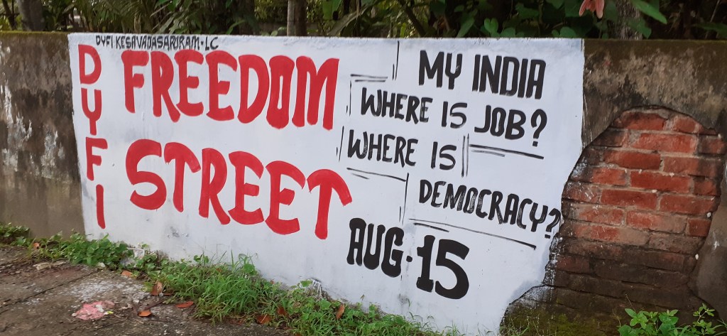 തുടരുന്നു…. രാവിലെ പതിവ് നടത്തിന് ഇറങ്ങിയപ്പോൾ എഴുതാനുള്ളത് എവിടുന്നെങ്കിലും കിട്ടുമെന്ന് ഉറപ്പ് ഉണ്ടായിരുന്നു. കണ്ണുകൾ വിടർത്തി നടന്നു. ( മൊബൈലിൽ ‘Run’ എന്ന ആപ്പും ഓപ്പൺ ആക്കിവെച്ചിട്ടുണ്ടെ.) ആദ്യം തന്നെ കണ്ണ് ചെന്ന് എത്തിയത് ഒരു ചുമരെഴുത്തിലായിരുന്നു. തലേന്ന് കുറെ പയ്യന്മാർ നിന്ന് എഴുതാൻ തുടങ്ങിയത് കണ്ടതാണ്. അതിന്റെ പൂർണതയാണ് എന്റെ മുൻപിൽ ഇപ്പോൾ.